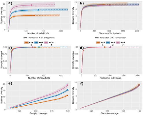 La robustez de la muestra se midió con curvas de acumulación de diversidad basadas en el tamaño de la muestra, en las que el número de diversidad de Hill y el Índice de Shannon esperados se representan gráficamente en función del tamaño de la muestra mediante el número de individuos (Chao et al., 2014; Cox et al., 2017). También, se usaron curvas de diversidad basadas en la cobertura para trazar la diversidad esperada en función de la cobertura interpolada (observada) y extrapolada (esperada).