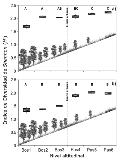 La mayor diversidad (H'=2.13) se registró en el nivel altitudinal Pas6 (4 096 m), y la menor (H'=1.5) correspondió al nivel altitudinal Bos1 (4 043 m; Figura 4). El Índice de Diversidad de Shannon se relacionó positivamente con el aumento de altitud en las parcelas orientadas al noroeste (F=15.22, P=0.0022) y en las parcelas con orientación este-sureste (F=8.47, P=0.0012; Figura 5). La diversidad de los sitios de muestreo también difirió significativamente (F=3.67, P=0.017); los sitios 1, 2 y 3, con orientación este-sureste presentaron la mayor diversidad (Figura 5).