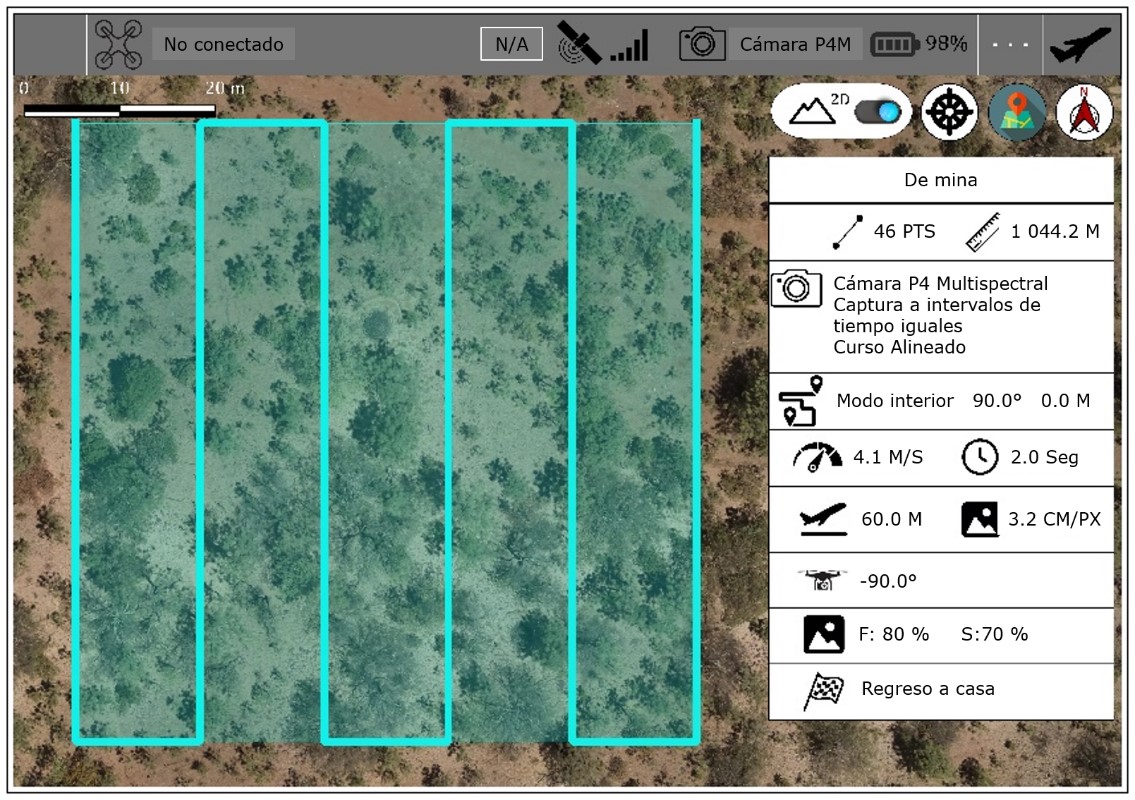 Durante cada vuelo se captaron, con el VANT, un total de 141 imágenes RGB y 705 imágenes multiespectrales, las cuales se utilizaron para crear el ortomosaico multiespectral.