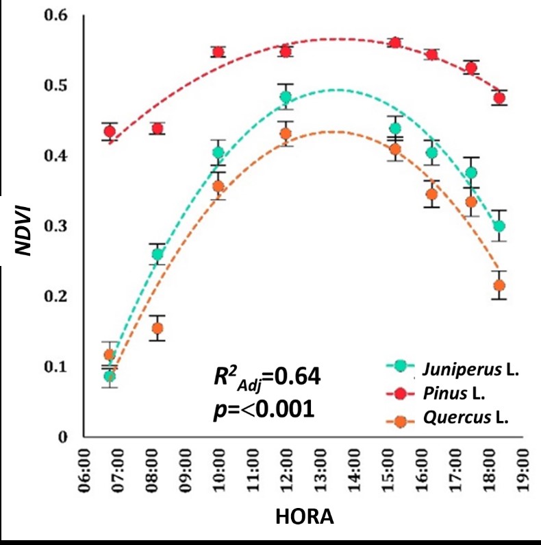 El NDVI no permanece fijo a lo largo del día, lo que podría atribuirse al ángulo del sol. Los valores máximos se obtuvieron a las 13:00 h para todos los géneros y posteriormente disminuyeron a medida que el ángulo cenital solar disminuía.