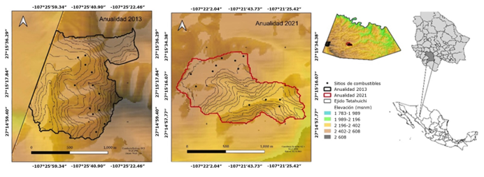 El presente trabajo se realizó en un bosque templado en la Sierra Tarahumara, perteneciente a la Sierra Madre Occidental (SMO), en el ejido Tetahuichi, municipio Guachochi, Chihuahua, México. En dos áreas correspondientes a las anualidades de aprovechamiento forestal 2013 y 2021 (Figura 1). En la primera área, la anualidad (2013) se ubica en las coordenadas extremas 27°14′50″ a 27°15′45″ de latitud norte y -107°25′16″ a -107°26′10″ de longitud oeste. La segunda (2021) entre 27°14′57″ y 27°15′33″ de latitud norte y -107°21′11″ y -107°22′16″ de longitud oeste, entre 2 300 y 2 440 msnm.