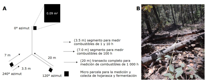 A = Arreglo utilizado para registrar la carga y estructura de los combustibles presentes en el sitio; B = Vista en campo que muestra la distribución del material combustible fino y grueso.