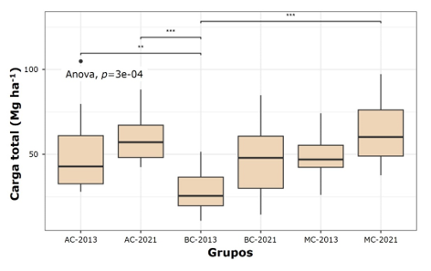 La carga de combustibles promedio para la anualidad 2013 fue de 43.21 Mg ha-1 y para 2021 de 55.22 Mg ha-1. La prueba estadística mostró diferencia entre las cargas totales (F1, 70=8.61, p=0.004); sin embargo, la primera hipótesis fue rechazada, debido que el tiempo transcurrido desde el aprovechamiento no influyó en la acumulación de combustibles.En relación a la carga por tipos de cobertura, la anualidad 2013 en coberturas cerradas (AC) registró 50.87 Mg ha-1, coberturas medias (MC) 48.64 Mg ha-1 y en áreas abiertas (BC) 30.16 Mg ha-1. Las estimaciones de 2021 tuvieron un aumento de carga (AC=59.26; MC=61.34 y BC=45.06 Mg ha-1). Las coberturas homólogas presentaron diferencias de 8.39, 12.7 y 14.9 Mg ha-1, respectivamente. Una vez verificados los supuestos de normalidad para la carga por cobertura (W=0.98, p=0.35), se aplicó un ANOVA que evidenció diferencias entre las coberturas (F5, 66=5.44, p<0.001); la prueba Tukey mostró diferencias entre las coberturas AC-2013, AC-2021 y MC-2021, respecto a la BC-2013. Por lo tanto, la variación de carga total en las coberturas de ambas anualidades soporta la segunda hipótesis, al evidenciar que las coberturas altas registraron mayor acumulación de material inflamable (Figura 3 y Cuadro 4).