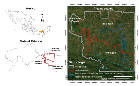Eastern Tabasco (ET) comprises the Balancán, Emiliano Zapata and Tenosique municipalities, in Southeast of Mexico (Figure 1), covering a surface area of 6 234.2 km2, which represents 24.7 % of the state. The region borders the state of Campeche to the North, shares an international border with the Republic of Guatemala to the East and South, and borders the state of Chiapas to the Southwest. From North to South, warm subhumid climates with summer rainfall (Aw), warm humid climates with abundant rainfall in summer (Am), and warm humid climates with abundant rainfall throughout the year (Af) prevail. The average annual precipitation varies from 1 600 to 2 000 mm, and the average annual temperature ranges from 26 to 28 °C (Aceves-Navarro & Rivera-Hernández, 2019). The territory features geomorphological regions of coastal terraces, karst terraces, active river plains, and sloping karst mountains (Zavala-Cruz et al., 2016).
