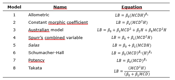 LB = Leaf biomass (g); MCD = Mean crown diameter (cm); H = Total height (cm); β0..., βn = Coefficients of regression. Source: Segura and Andrade (2008).