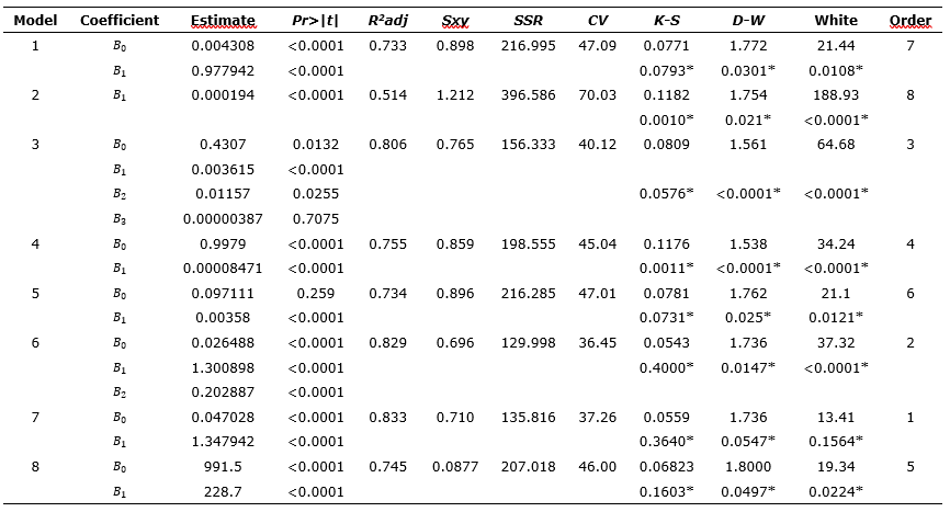* = Pr>|t| = Statistical significances at 95 %; R2adj = Adjusted coefficient of determination; Sxy = Standard error; SSR = Sum of squared residuals; CV = Coefficient of variation (%); K-S = Kolmogorov-Smirnov normality test; D-W = Durbin-Watson autocorrelation statistic; White = White's heteroscedasticity test; Order = Order of model selection.