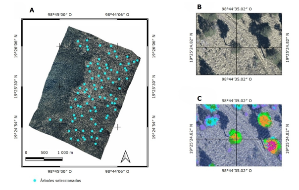 Sobre el ortomosaico, desplegado en el software QGis versión 3.42 (QGIS Development Team, 2024), se seleccionaron 85 árboles de Pinus hartwegii distribuidos en el área de estudio (Figura 1A), que se pudieran reconocer en campo (Figura 1B), y se registraron sus coordenadas UTM.