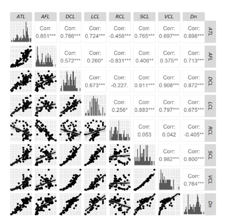 Con base en el análisis de correlación entre las variables predictoras LiDAR y la variable de respuesta, ATL, DCL y SCL presentaron las mayores correlaciones (r≥0.8; p<0.01) con el Dn (Figura 3). Sin embargo, SCL mostró alta correlación con DCL (r=0.911; p<0.001) y VCL (r=0.982; p<0.001); lo que sugiere un problema potencial de autocorrelación con estas variables, por lo que SCL se descartó como posible variable predictora del Dn. VCL es la siguiente variable con mayor correlación con el Dn (r=0.764; p<0.001); sin embargo, tiene una alta correlación con DCL (r=0.908; p<0.001), por lo que también se descartó. La variable AFL tuvo un Coeficiente de Correlación con el Dn de 0.713 (p<0.001) y la correlación con las otras posibles variables predictoras fue menor a 0.9. Por ello, AFL se consideró como la tercera variable independiente para incluir en los modelos que estiman Dn.