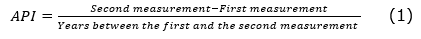 The first height measurement was taken in early 2013, after the initial growth period; while the first normal diameter measurement (at 1.30 m height) was taken in early 2019, when all trees exceeded 1.30 m. Height and normal diameter were measured using a model MGA 725 Cadena® caliper and a model IP67 ABSOLUTE Miltutoyo® digital caliper, respectively. The second measurement of both variables was taken in early 2023, 10.5 years after the trial was established. For these measurements, normal diameter was determined using a model Mantax Blue 400 mm Haglöf® caliper, and height was determined using a model W-Germany Haga® hypsometer. Using the data from the first and second assessments, the Annual periodic increment in height (APIH) and normal diameter (APIDN) were calculated using the following Equation (Imaña & Encinas, 2008):