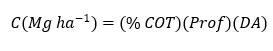 El carbono orgánico total (COT) se determinó con un autodeterminador automático de C (Shimadzu® TOC SSM 5050A). Para el cálculo de la masa de carbono se utilizó el contenido de carbono orgánico en porcentaje (% COT), la densidad aparente y los espesores de horizontes de muestreo. Dado que el suelo es volcánico, ácido y no reactivo al HCl, no se hicieron estimaciones de corrección por carbono inorgánico (carbonatos). La cantidad de carbono en toneladas o Megagramos (Mg) por hectárea se estimó con la siguiente fórmula, que ya considera de manera implícita un factor de ajuste de unidades: