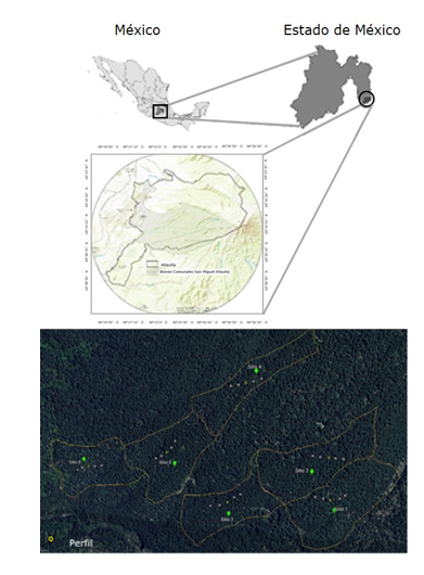 El área de estudio se ubicó entre las coordenadas extremas 19°04′58.04″-18°59′26.67″ latitud norte y 98°37′46.25″-98°48′45.38″ longitud oeste (Figura 1),y corresponden a las tierras forestales de Bienes Comunales de San Miguel Atlautla, municipio Atlauta, Estado de México. El clima es C(E)(w2)(w)b(i)g semifrío, subhúmedo, con lluvias en verano, con precipitación invernal menos a 5%, temperatura media anual entre 5 y 12 °C, con una precipitación media anual de 800 a 1 300 mm. Los suelos presentes, de acuerdo con la clasificación FAO-UNESCO de 1988 son Regosol eútrico y Andosol vítrico de textura gruesa (Instituto de Información e Investigación Geográfica, Estadística y Catastral del Estado de México [Igecem], 2019). De acuerdo con la Serie VII-Uso de suelo y vegetación del Instituto Nacional de Estadística y Geografía (Inegi, 2018), la vegetación está conformada por bosque de oyamel [Abies religiosa (Kunth) Schltdl. & Cham.].