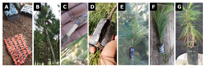A = Sustrato de peat moss con diferentes concentraciones de AIB; B = Ascenso al árbol; C = Anillado de rama; D = Colocación de bolsa con sustrato; E = Acodo aéreo; F = Separación de acodo de la planta madre; G = Trasplante del acodo.