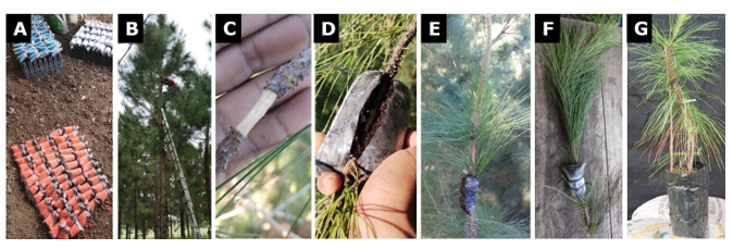 Rooting cuttings is not feasible in pine trees older than two years because the capacity for adventitious rooting decreases due to their physiological maturity and cellular specialization (Bautista-Ojeda et al., 2022). Furthermore, grafting techniques are difficult, mainly due to the lack of tropical pine rootstocks and the limited information on interspecific graft compatibility. Therefore, air layering can be a viable initial alternative for conserving and propagating, on a smaller scale, trees of interest from the Pinus genus older than five years and for obtaining clones adapted to the donor region (Vacek et al., 2012). However, the effectiveness of this technique can vary with the species (Stuepp et al., 2018), as described by Singh and Ansari (2014) for five tropical species.