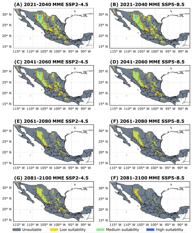 The MaxEnt model, combined with high-resolution climate data from CHELSA v2.1 and a Multi-Model Ensemble (MME) from CMIP6, indicates a significant reduction in the distribution area under the SSP2-4.5 and SSP5-8.5 scenarios throughout the 21st century, with a more severe contraction under SSP5-8.5. In the latter scenario, it is estimated that by the end of the century only about 10 % of the currently suitable areas will remain, restricted mainly to mountainous regions. The temperatures of the driest (Bio 9) and wettest (Bio 8) quarters were identified as the main climatic factors limiting the species' distribution in Mexico.