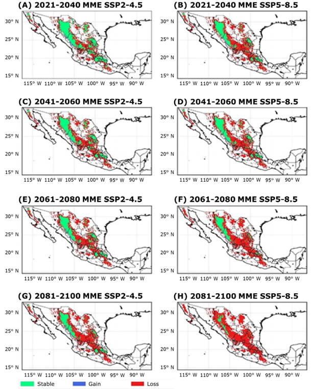 However, stable areas are projected to persist in the Sierra Madre Oriental and Sierra Madre Occidental, while new areas of limited suitability are expected to emerge in Baja California, Coahuila, Nuevo León and Puebla. These patterns align with studies based on CMIP5 (Romero-Sánchez et al., 2017), suggesting the presence of potential climate refuges for the species despite the adverse impacts of climate change.