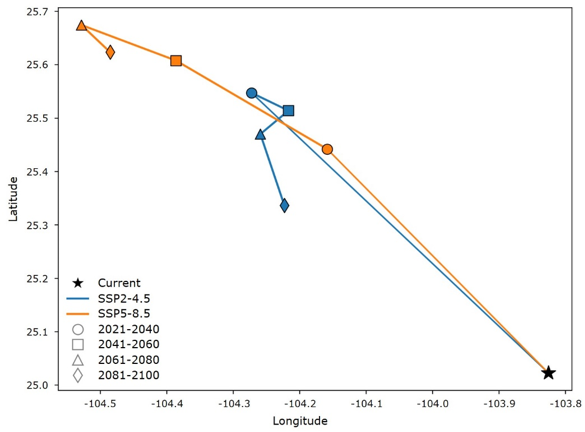 Figure 5. Centroid of the distribution of Pinus cembroides Zucc. under future climate conditions.