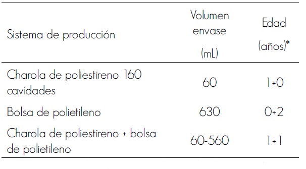 Se seleccionaron ejemplares de Pinus pseudostrobus cultivados en tres sistemas de producción (Cuadro 1) en el Vivero Forestal Bosque Escuela de la Facultad de Ciencias Forestales (UANL), ubicado en el ejido Santa Rosa, municipio Iturbide, Nuevo León, en las coordenadas 24°42.37’ N y 99°51.69’ O y a una altitud de 1 609 m. En todos los sistemas, las plantas estuvieron bajo condiciones de sombra durante el primer año y a la intemperie en el segundo año, para el caso del sistema en bolsa de polietileno. Como sustrato se utilizó una mezcla de turba de musgo (57 %) y tierra de monte (43 %), a la que se le agregaron 5 kg m-3 de fertilizante de liberación controlada (Osmocote®). Durante el periodo de producción se aplicaron riegos cada tres días, de acuerdo a las rutinas convencionales del vivero.