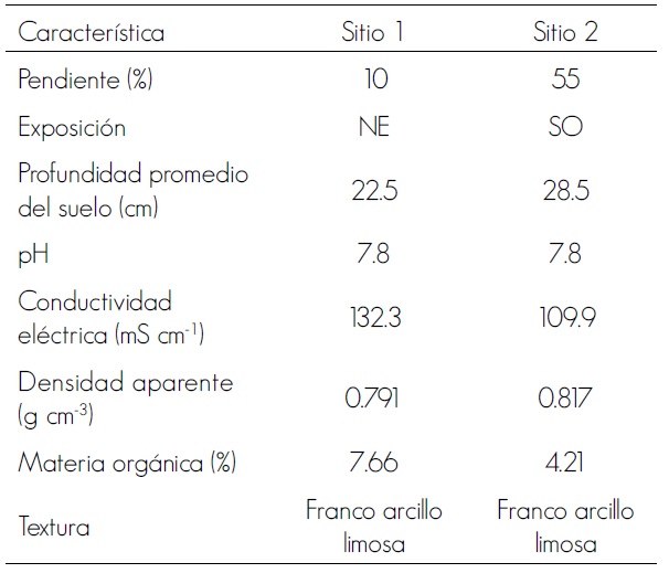 El material se llevó a campo en noviembre de 2011, la plantación se estableció en el municipio Galeana, Nuevo León. El área de estudio se ubica en las coordenadas 24°50.81’ N y 100°5.55’ O y una altitud de 1 760 m; presenta una precipitación media anual de 428 mm con una temperatura media de 14 °C. Se eligieron dos sitios de condiciones contrastantes (Cuadro 2), separados a una distancia de 200 m. En cada uno se plantaron 24 individuos por tratamiento, divididos en tres repeticiones y situados a 1 m de separación; en total se emplearon 432. El diseño experimental fue en parcelas subdivididas, las grandes correspondieron a los sitios, las medianas el sistema de producción y las parcelas chicas al nivel de preacondicionamiento.