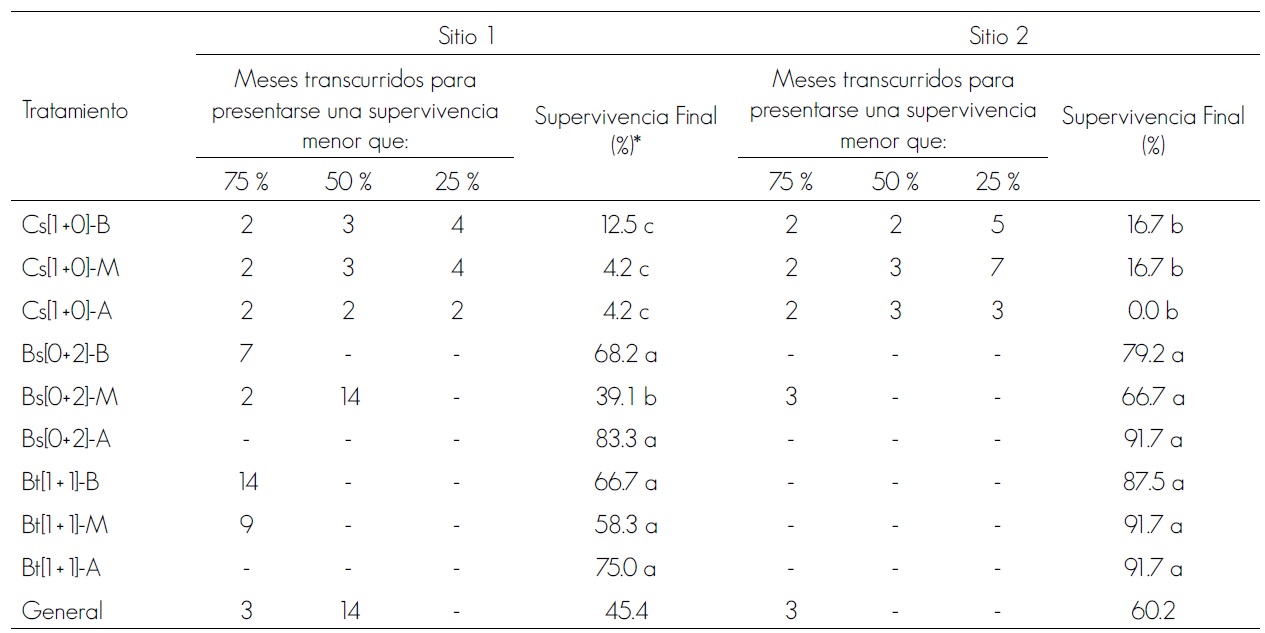 Tratamientos: Sistema de producción: Cs [1+0] = Siembra en charola; Bs [0+2] = Siembra en bolsa; Bt [1+1] = Siembra en charola y trasplante a bolsa; Preacondicionamiento: B = Nivel bajo; M = Nivel moderado; A = Nivel alto.*Letras diferentes indican diferencias estadísticas significativas mediante la prueba Log-Rank.
