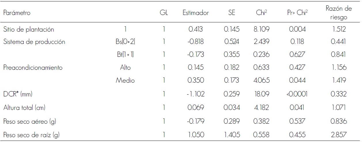 El análisis evidenció un efecto altamente significativo del diámetro al cuello de la raíz sobre la función de riesgo, con signo negativo en el estimador y una relación de riesgo de 0.332, lo que significa que el incremento de 1 mm en el diámetro de la planta reduce el riesgo de muerte hasta en 66.8 %; es decir, 100(1 -e-1.102), siempre y cuando se mantengan constantes las otras variables.